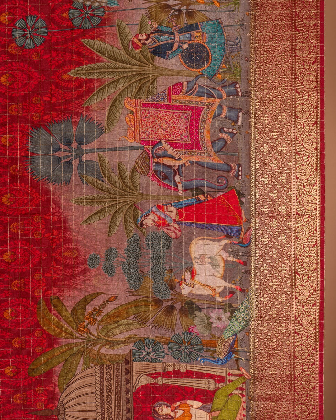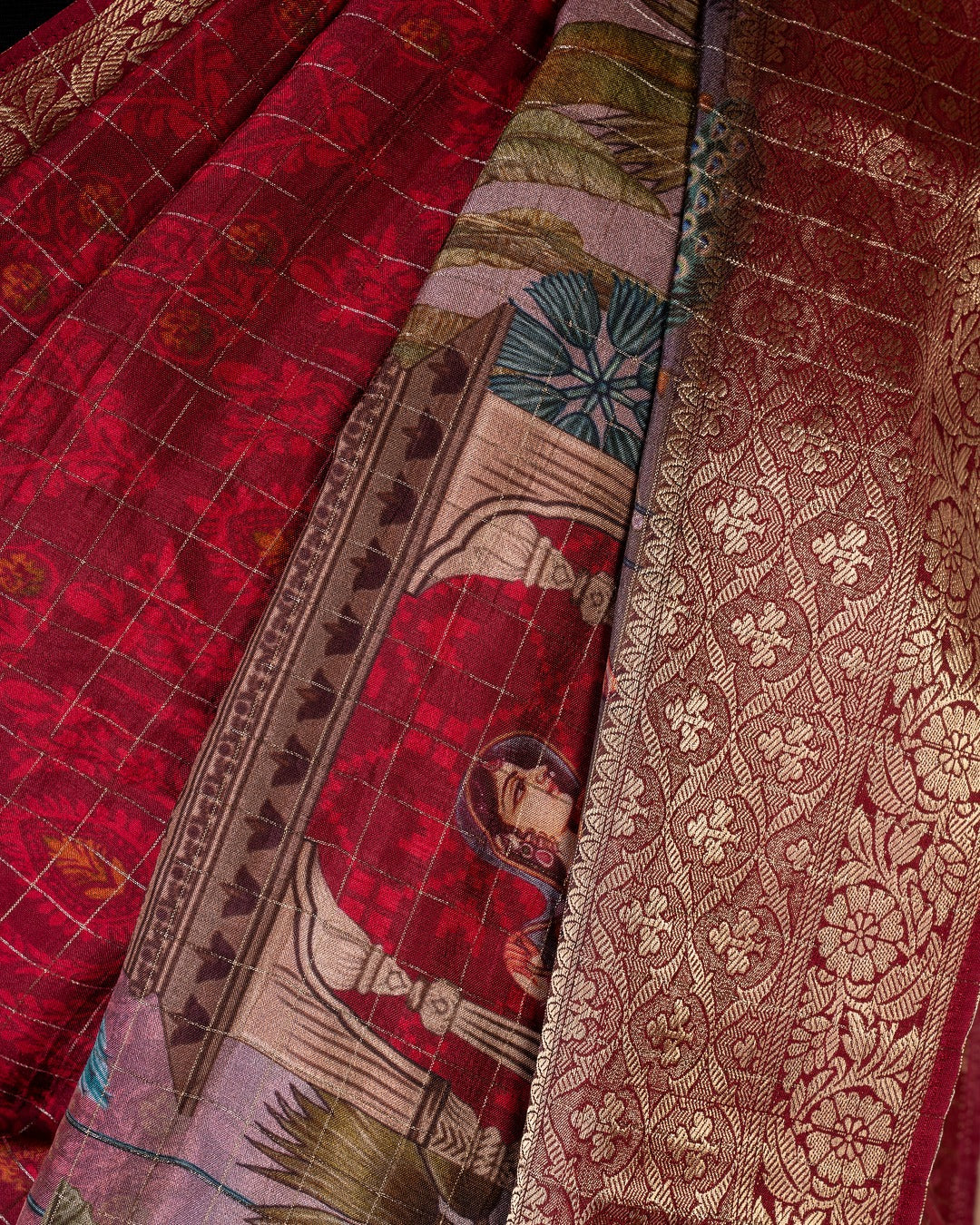 Drape yourself in royal elegance with this maroon Banarasi silk saree, featuring golden checkered patterns and a luxurious antique zari border.